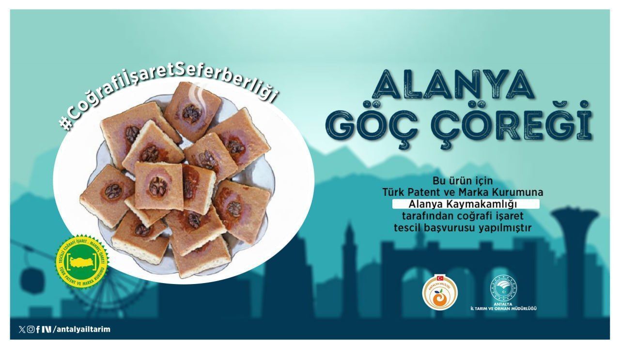 Antalya Valiliği öncülüğünde yürütülen #CoğrafiİşaretSeferberliği çalışmaları kapsamında, kentin köklü lezzetlerinden Alanya Göç Çöreği için Türk Patent ve Marka Kurumu’na coğrafi işaret tescil başvurusu yapıldı.