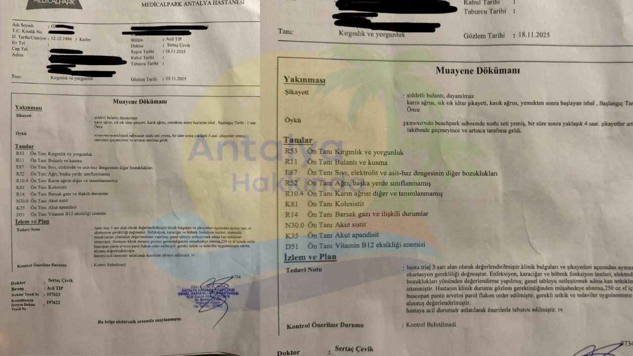 Olay Antalya'nın Konyaaltı ilçesindeki Beach Park'ta yaşandı. İddiaya göre, 15 Kasım akşamı söz konusu restoranda sushi yiyen müşteriler ertesi gün fenalaşarak hastaneye kaldırıldı. Çok sayıda kişinin zehirlendiği öne sürülürken, bazı vakalarda tedavi sürecinin hâlâ devam ettiği öğrenildi.
