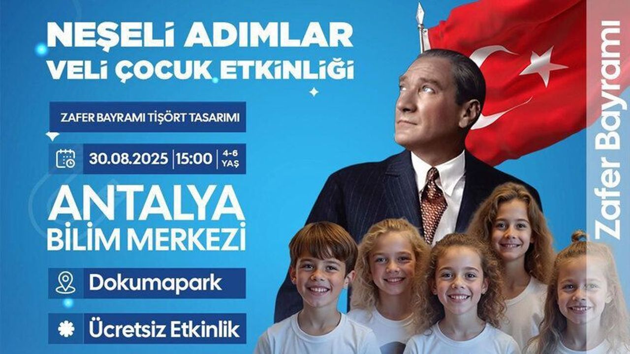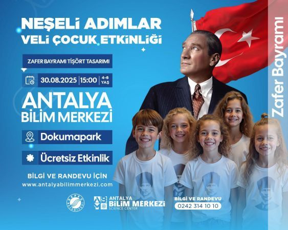 Antalya Bilim Merkezi, 30 Ağustos Zafer Bayramı’na özel birbirinden renkli ve öğretici etkinlikler düzenliyor. Etkinlikler kapsamında saat 15.00’te, 4-6 yaş grubuna yönelik “Neşeli Adımlar Veli Çocuk Etkinliği” gerçekleştirilecek. Ücretsiz olarak düzenlenecek bu atölye çalışmasında, çocuklar aileleriyle birlikte kendi Zafer Bayramı temalı tişörtlerini tasarlayacak. Çocuklar bayram coşkusunu doyasıya yaşarken, ebeveynleriyle de keyifli vakit geçirecekler.