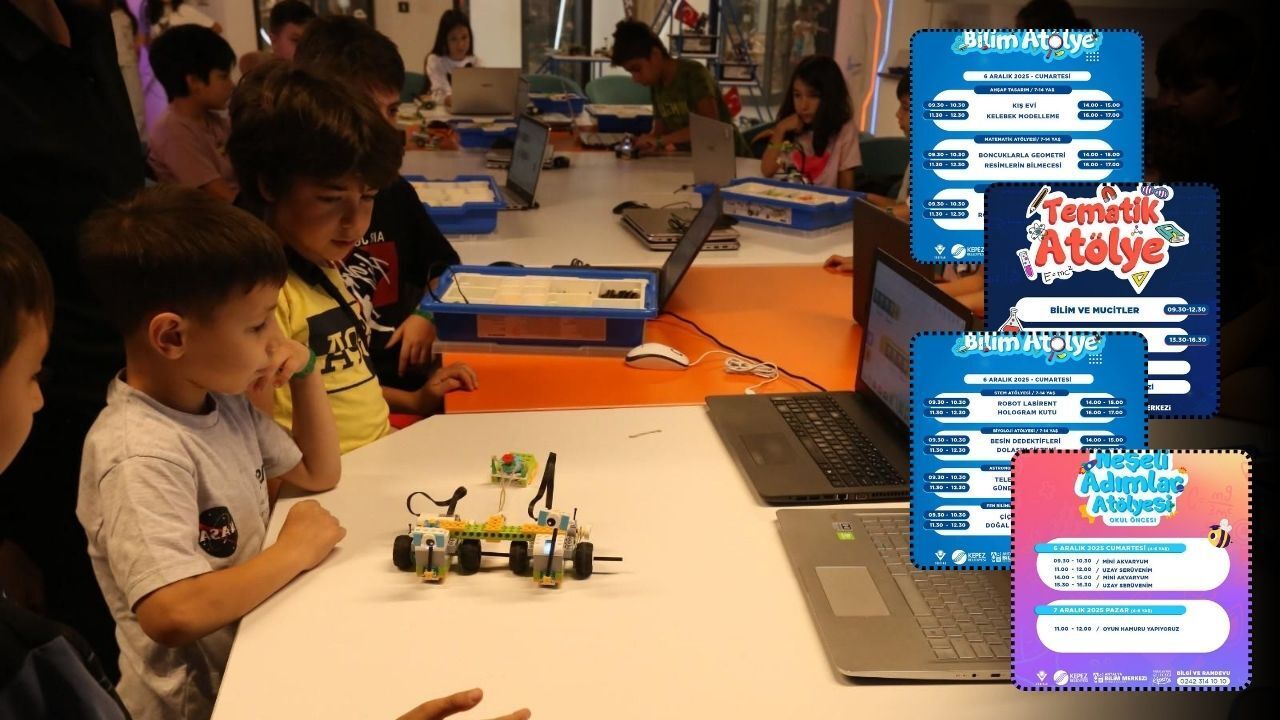 Antalya Bilim Merkezi bu hafta sonu da dolu dolu bir programla çocukları bilimin heyecanıyla bir araya getirecek. Dokumapark’ta hizmet veren Bilim Merkez, 6–7 Aralık tarihlerinde farklı yaş gruplarına yönelik onlarca atölye çalışmasıyla ziyaretçilerini ağırlayacak.6 Aralık Cumartesi günü 7–14 yaş gruplarına yönelik STEM, biyoloji, astronomi, fen bilimleri, ahşap tasarım, matematik ve robotik kodlama atölyelerinde robot labirent, hologram kutu, besin dedektifleri, dolaşım sistemi, teleskop yapımı, güneş sistemi, çiçek devresi, doğal roll on üretimi, kış evi ve kelebek modelleme, boncuklarla geometri, resimlerin bilmecesi, araba park sensörü ve robot fabrikası dansçı çalışmaları gerçekleştirilecek. Atölyeler sabah 09.30, 10.30, 11.30, 12.30; öğleden sonra ise 14.00, 15.00, 16.00 ve 17.00 saatlerinde yapılacak. Robotik Kodlama araba park sensörü, robot fabrikası dansçı atölyeleri 8-14 yaş gurubuna yönelik düzenleyecek.