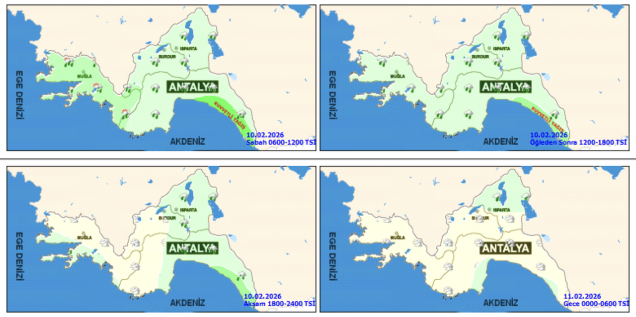 Meteoroloji Genel Müdürlüğü'nden alınan bilgilere göre Antalya ve ilçelerinde 10 Şubat Salı günü (Bugün) havanın parçalı ve çok bulutlu, Muğla çevreleri ile Antalya'nın doğu kesimlerinin yerel kuvvetli olmak üzere, bölge genelinin aralıklı sağanak ve gök gürültülü sağanak yağışlı, iç kesimlerin yağmur ve sağanak yağışlı geçeceği tahmin ediliyor. Yüksek kesimlerde karla karışık yağmur ve kar yağışı beklenmektedir.