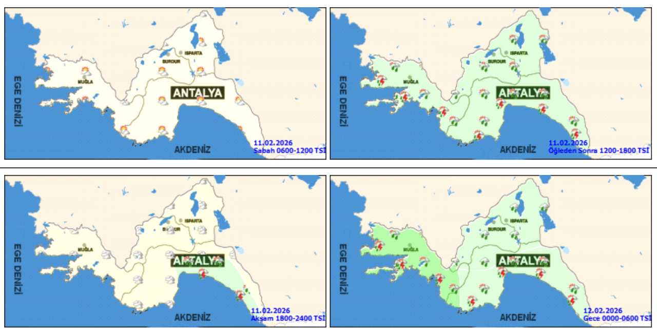Meteoroloji Genel Müdürlüğü'nden alınan bilgilere göre Antalya ve ilçelerinde 11 Şubat Çarşamba günü (Bugün) havanın parçalı ve çok bulutlu, bölge geneli aralıklı sağanak ve gök gürültülü sağanak yağışlı, iç kesimlerin yağmur ve sağanak, yükseklerinin karla karışık yağmurlu geçeceği tahmin ediliyor.