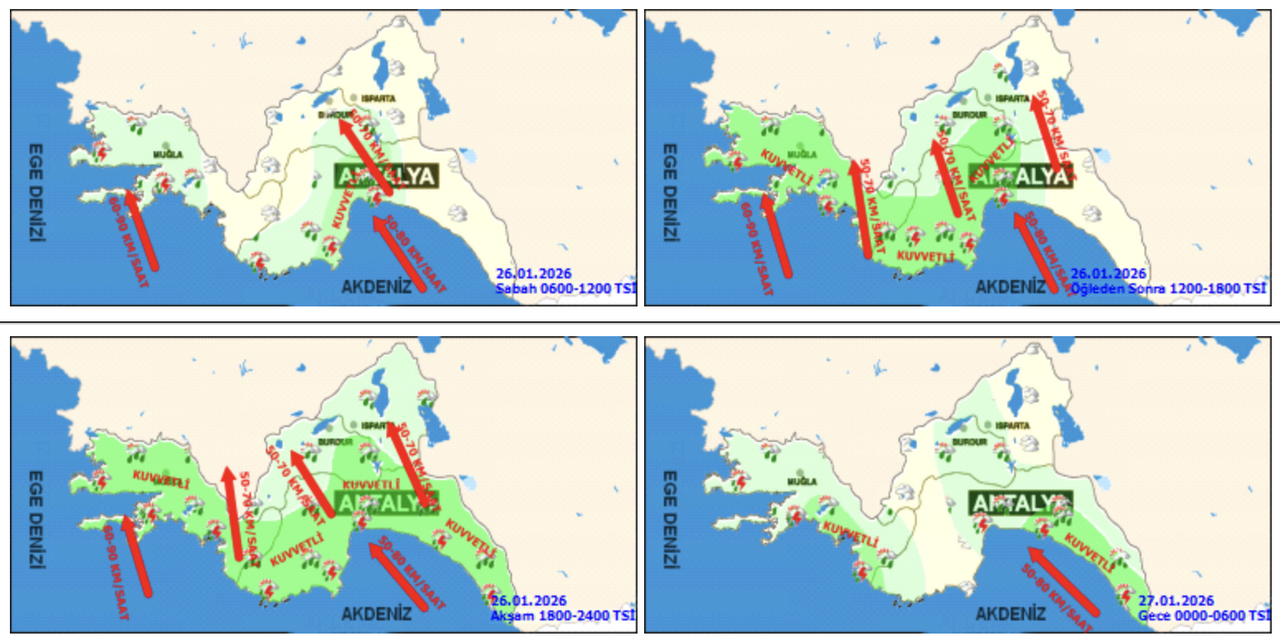 Denizlerimizde rüzgarın Bodrum-Kaş arasında; güney ve güneydoğu, zamanla güneybatı yönlerden 6 ila 8 kuvvetinde fırtına, yer yer 9 kuvvetinde kuvvetli fırtına şeklinde eseceği tahmin edilmektedir. Kaş-Anamur arasında (Antalya Körfezi) denizlerimizde rüzgarın; öğle saatlerinden sonra doğu ve güneydoğu yönlerden 6 ila 8 kuvvetinde fırtına şeklinde eseceği tahmin ediliyor.
