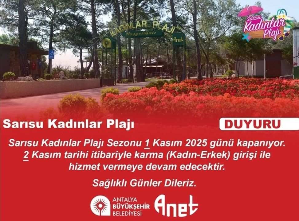 ANET’ten yapılan açıklamada, Sarısu Kadınlar Plajı’nın sezonunun 1 Kasım Cumartesi günü kapanacağı, 2 Kasım tarihinden itibaren ise plajın kadın-erkek karışık hizmet vereceği bildirildi. Açıklamada, “Sezonu kapatıyoruz ama kapılarımız açık” ifadelerine yer verildi.