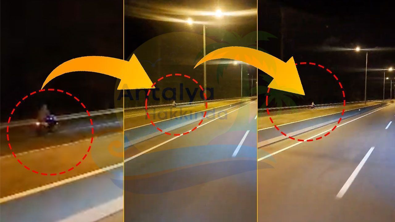 Antalya’da Batı Çevre Yolu’nda ters yönde ilerleyen plakasız bir motosiklet sürücüsü, hem kendi canını hem başka sürücülerin canını tehlikeye attı. O anlar bir sürücünün cep telefonu kamerasına saniye saniye yansıdı.