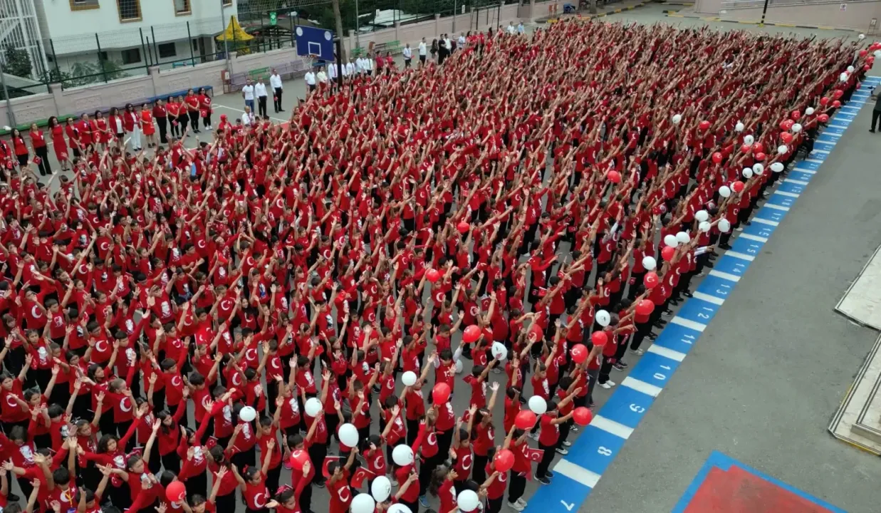 Okul bahçesinde yaklaşık 1500 öğrencinin hep bir ağızdan söylediği şarkılar ve gerçekleştirdikleri koreografi, havadan da görüntülendi.