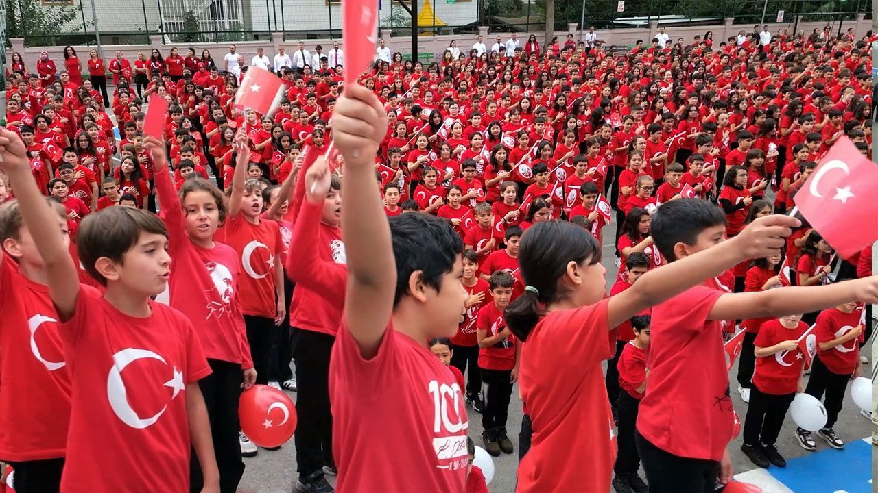 Antalya'nın Muratpaşa ilçesindeki Mecdude Başakıncı Ortaokulu'nda 29 Ekim Cumhuriyet Bayramı ile Cumhuriyet'in ilanının 102'nci yılı coşkuyla kutlandı. Üzerlerine Atatürk'ün portresi ve ay yıldızın yer aldığı kırmızı tişörtler giyip, ellerinde Türk bayrakları sallayan öğrenciler, öğretmenlerinin yönlendirmesiyle Cumhuriyet konulu şarkılar seslendirdi.