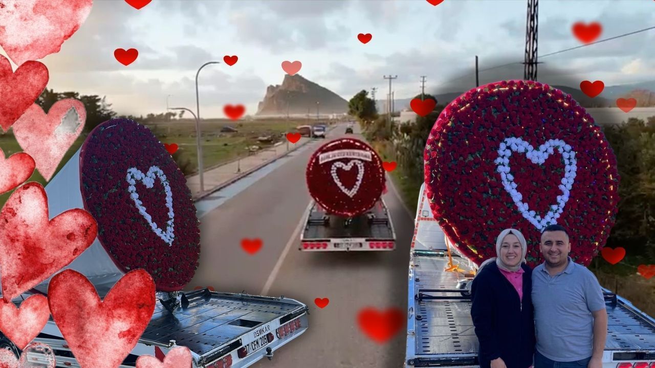 Antalya'da bir vatandaş Sevgililer Günü'nde eşine büyük sürpriz hazırladı. Araç platformu büyüklüğünde hazırlanan tasarım, ana arterlerde dikkat çekti. Kırmızı güllerle kaplanan yuvarlak düzenlemenin ortasında yer alan beyaz kalp figürü, vatandaşların cep telefonlarına sarılmasına neden oldu. Genç çiftler ve aileler dev kalbin önünde hatıra fotoğrafı çektirirken, görüntüler sosyal medyada kısa sürede yayıldı. Çekicinin ilçe sokaklarındaki ilerleyişi dronla da kayıt altına alındı.