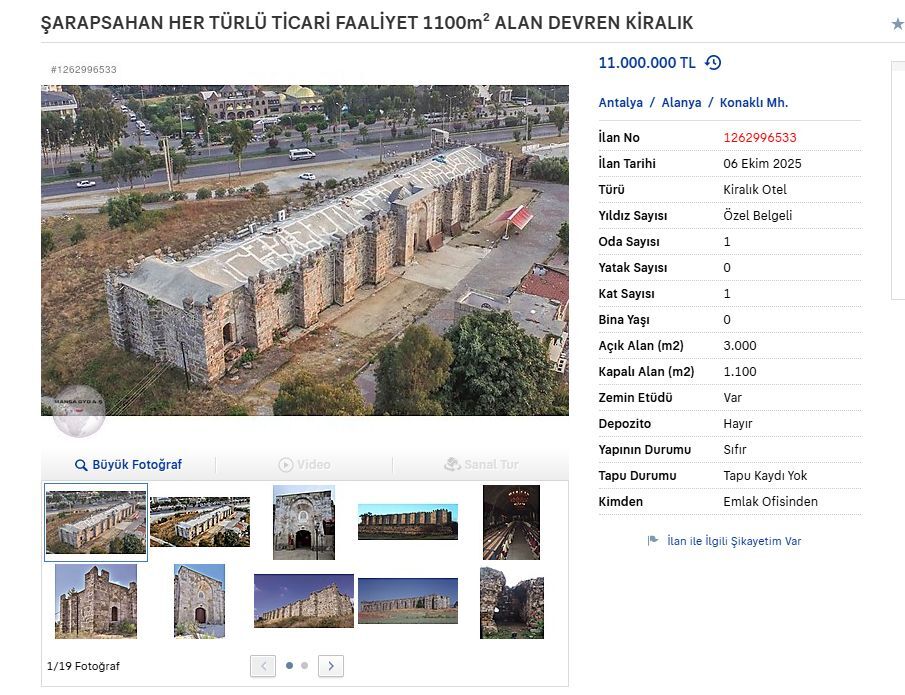 Tarihi yapı, Vakıflar Genel Müdürlüğü’ne ait olmasına rağmen, mevcut kiracısı tarafından popüler bir ilan sitesinde “Her türlü ticari faaliyet 1100 metrekare alan...” başlığıyla devren kiralık olarak 11 milyon TL’ye ilana çıkarıldı.