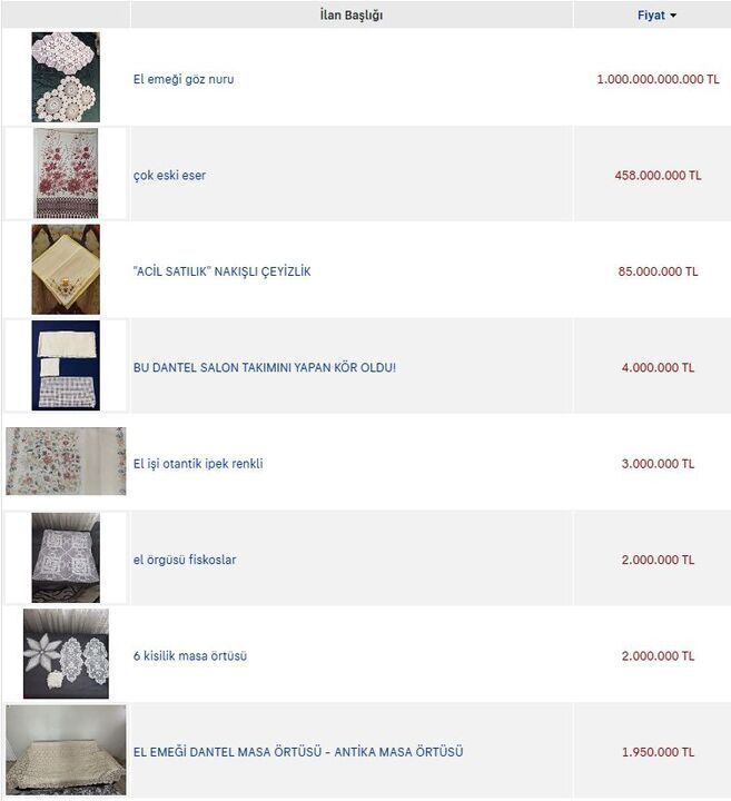 Son dönemde ikinci el satış platformlarında açılan ilanlarda, el örgüsü örtülere biçilen fiyatlar 2-3 milyon TL seviyelerine ulaştı. Özellikle nadir motifli, usta işi danteller koleksiyoncuların ilgisini çekiyor ve hem nostaljik hem estetik değeriyle piyasada öne çıkıyor.