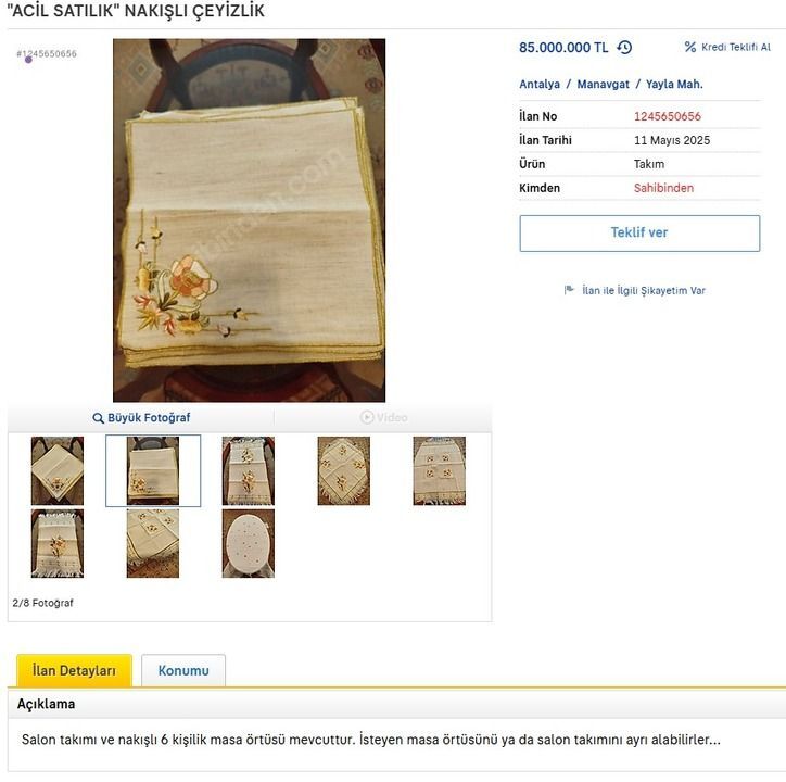 Antalya'nın Manavgat ilçesi Yayla Mahallesinden verilen bir ikinci el ilanı, sosyal medyanın ve koleksiyoncuların gündemine oturdu. “Acil satılık nakışlı çeyizlik” notuyla satışa çıkarılan dantel masa örtüsüne tam 85 Milyon TL fiyat biçildi. İlanda ayrıca şu ifadeler yer aldı: