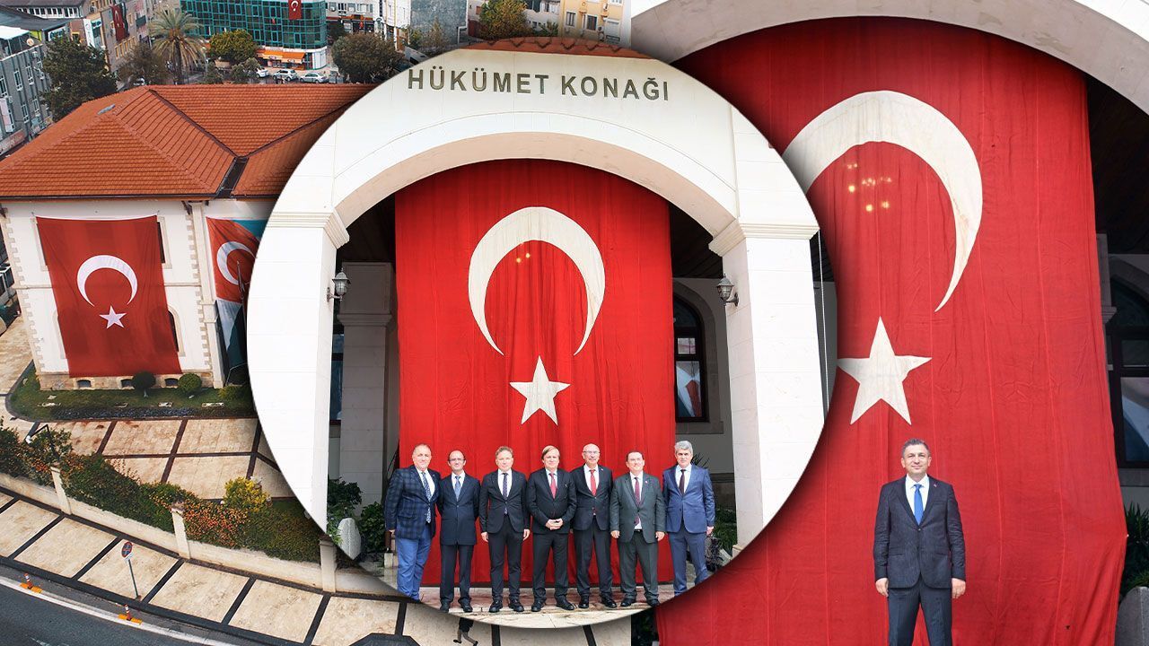 "100'üncü yıl kutlamaları çerçevesinde 2023 yılının 29 Ekim arifesinde arayışlarımız vardı, '100'üncü yılı hakkıyla nasıl idrak ederiz' diye. O süreç içerisinde böyle bir bayrağın olduğu söylendi bize. Bir koleksiyonerin koleksiyonunda olduğu, Cumhuriyet ile yaşıt bir bayrak olduğu söylendi. Koleksiyonerimizi bulduk. Bahadır Kalaycı adlı, gerçekten çok değerli bir dostumuz. Kendi özel koleksiyonundan bunu çıkardı. El yapımı bir bayrak tamamen ve yaşı da 1920'lere tekabül ediyor. Cumhuriyet ile yaşıt, el yapımı özel bir bayrak. Biz de Bahadır beyin yüksek müsaadesiyle 100'üncü yılda ilk defa astık. Şimdi her yıl asıyoruz ve Cumhuriyet'e tanık olan bu bayrağın önünde, biz de Cumhuriyet kutlama resepsiyonumuzu düzenliyoruz. Bir tarihe, Cumhuriyet'in serüvenine tanıklık eden bir bayrağın, şanlı bayrağımızın önündeyiz."