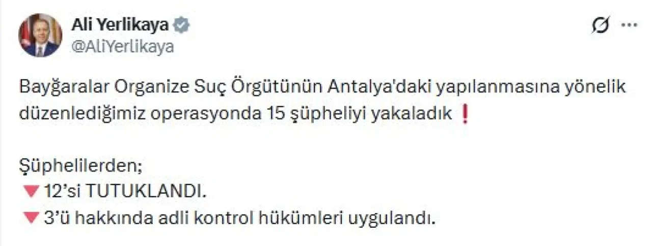 İçişleri Bakanı Yerlikaya, Antalya Emniyet Müdürlüğü tarafından düzenlenen operasyonu sanal medya hesabından duyurdu. Buna göre; elebaşılığını yurt dışında tutuklu bulunan R.B.'nin yaptığı organize suç örgütünün, Antalya yapılanmasının yöneticisi olan H.A. ile birlikte hareket eden şüphelilere yönelik operasyonda 15 kişi yakalandı. Şüphelilerin, suç örgütünün faaliyetleri kapsamında haksız çıkar sağlamak amacıyla hareket ettikleri, 'Adam öldürme', 'Yağma', 'Yaralama' ve 'İş yeri kurşunlama' suçlarını işledikleri tespit edildi. Operasyonda 1 uzun namlulu silah ile 3 ruhsatsız tabanca ele geçirildi. Şüphelilerden 12'si çıkarıldıkları hakimlikçe tutuklandı, 3'ü hakkında adli kontrol hükümleri uygulandı.