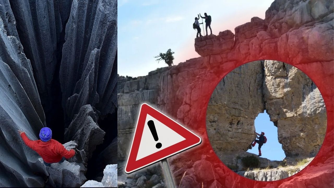 Antalya'nın Akseki ilçesiyle Konya'nın Seydişehir ilçesi sınırlarındaki Giden Gelmez Dağları, 100 metreyi bulan uçurumları, dikey mağaraları ve obruklarıyla oluşturduğu zorlu coğrafi şartlarıyla dikkat çekiyor. Yaban hayatının da zengin olduğu bölgedeki önemli doğa gezgini ve dağcılardan biri olan Mustafa Ünal, keskin kayalıklardan oluşan tehlikeli çukurları görüntüledi.