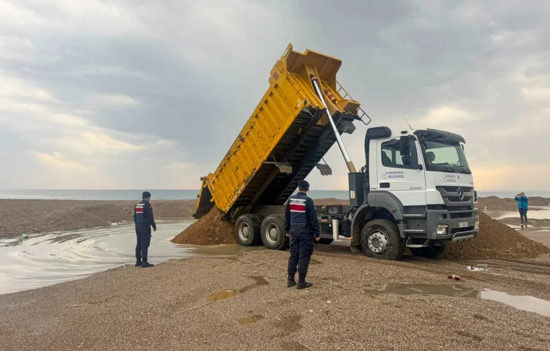 Antalya'nın Manavgat ilçesi Ulualan mevkisindeki sahilden çalındığı tespit edilen 50 kamyon kum, dev çukurlara neden olan yerlerine döküldü.