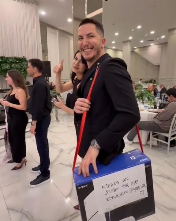 Hediyenin üzerine “FIFA’da hiç şansın yok ama evlilikte başarılar” notunu yazan arkadaşının bu jesti, davetliler arasında neşeli anlara sahne oldu. Notu okuyan damadın hem duygulandığı hem de güldüğü anlar gözlerden kaçmadı.