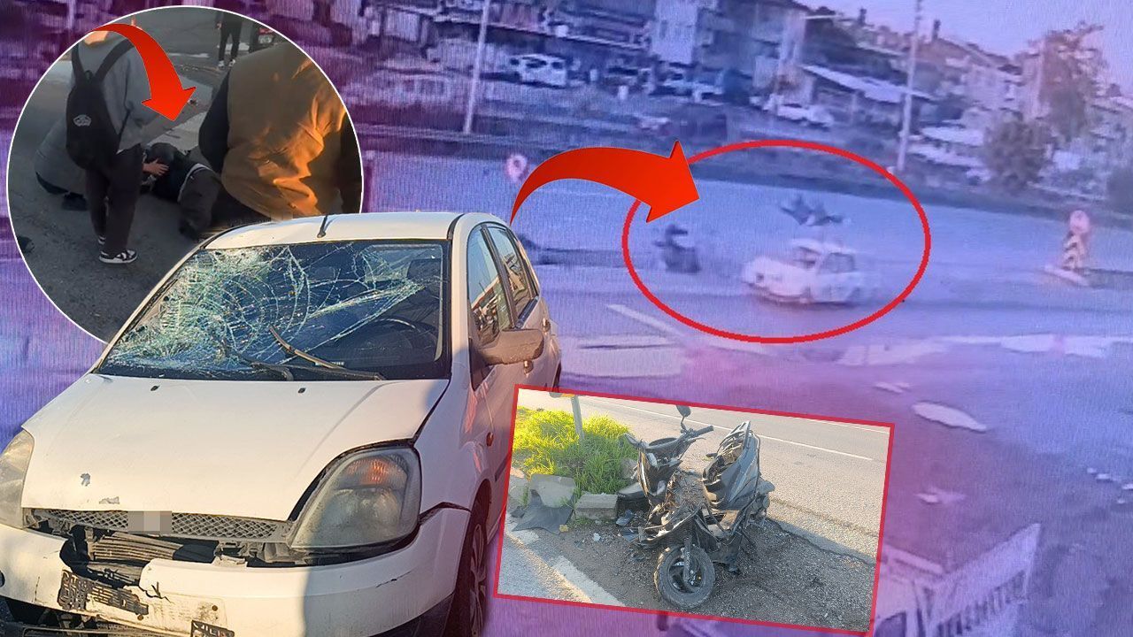 Güvenlik kamerasına saniye saniyesine yansıyan kazada, çarpışmanın şiddetiyle havaya fırlayan motorlu bisiklet sürücüsü yaralandı. Yaralı, 112 sağlık ekiplerinin olay yerindeki müdahalesinin ardından ambulansla hastaneye götürüldü.