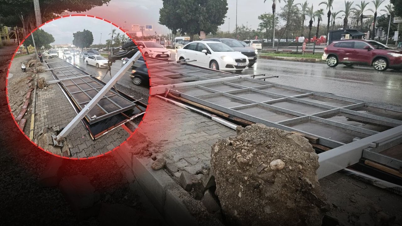 Antalya'da etkili olan sağanak ve fırtına nedeniyle bir otobüs durağının hemen yanında yer alan yaklaşık 20 metre uzunluğundaki dev tabela yerinden sökülerek, devrildi. Tabela, daha sonra gelen bir vinç tarafından bulunduğu yerden kaldırılıp götürüldü.
