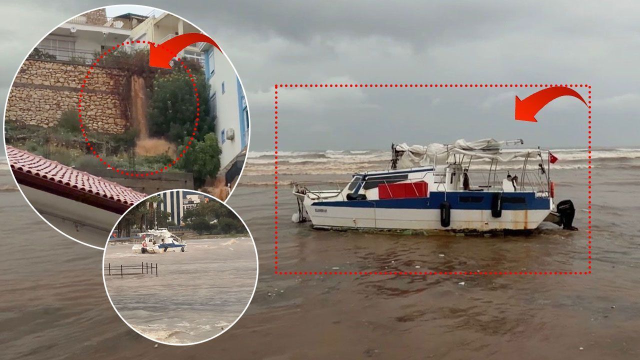 Finike meydan sahil bandındaki iskele yakınlarında özel bir tekne karaya otururken denizin rengide kahverengiye döndü. Atatürk caddesi Finike Merkez cami arkasındaki binaların istinad duvarları arasından sızan yağmur suları da küçük şelaleler oluşmasına sebep oldu.