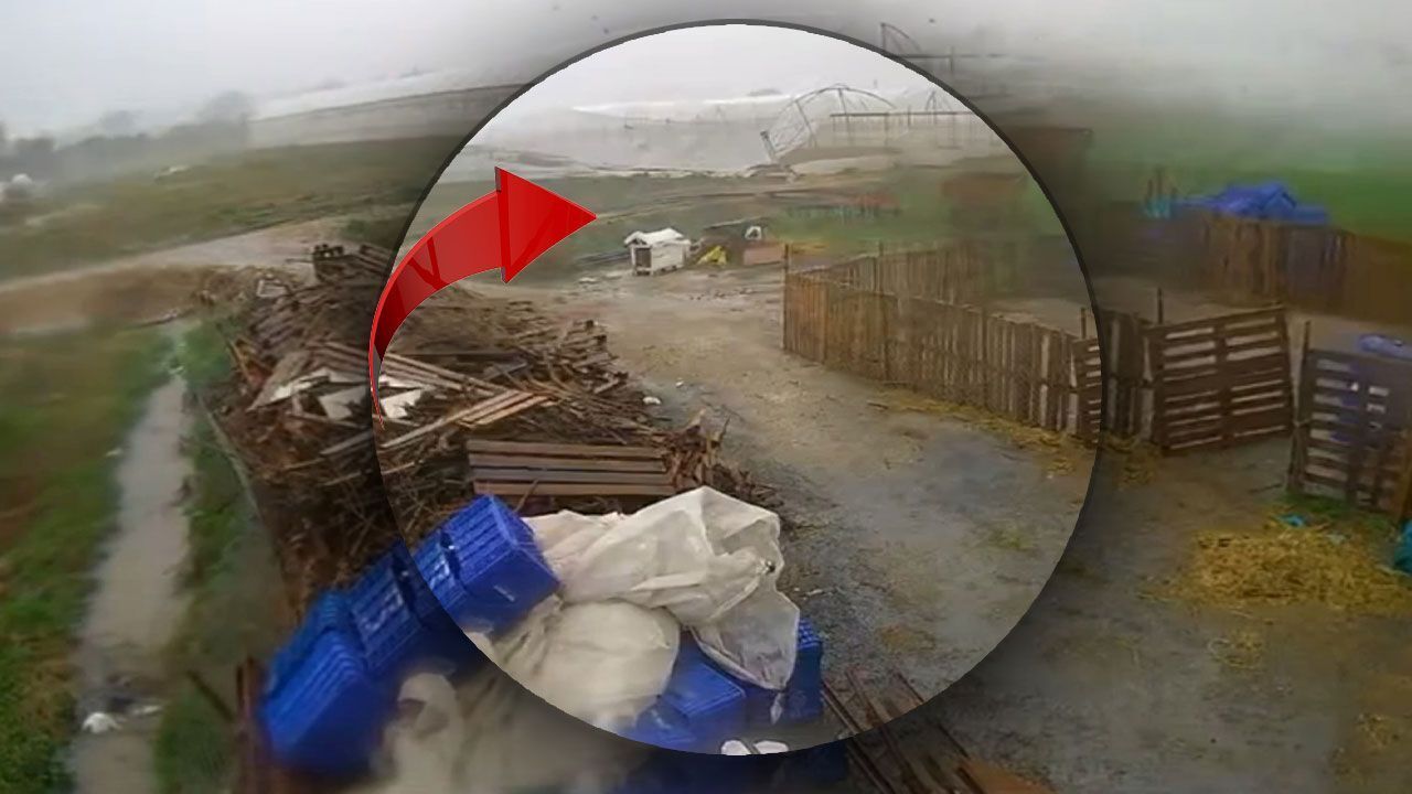 Hortumun seraya ulaştığı ve naylonların koparak savrulduğu anlar, çevredeki bir iş yerine ait güvenlik kamerasına anbean yansıdı. Görüntülerde sağanak yağış anında hortumun serayı vurduğu ve naylonların koparak çevreye savrulduğu görüldü.
