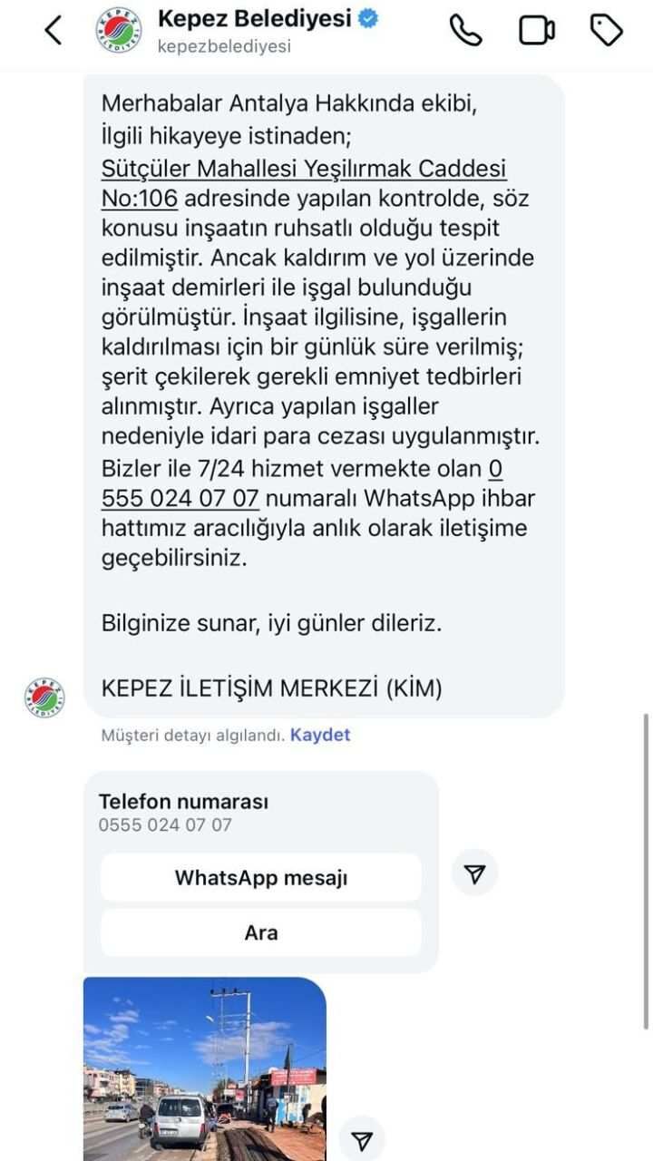 Artan tepkiler üzerine Kepez Belediyesi konuyla ilgili yazılı açıklama yaptı. Yapılan kontrolde, Sütçüler Mahallesi Yeşilırmak Caddesi No:106 adresindeki inşaatın ruhsatlı olduğu ancak kaldırım ve yol üzerinde inşaat demirleriyle işgal yapıldığının tespit edildiği belirtildi.