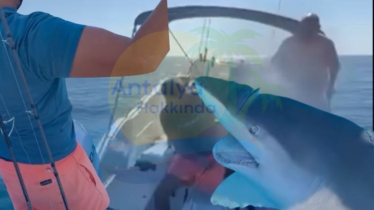 Antalya’nın Muratpaşa ilçesinde bulunan Konserve Koyu açıklarında balık tutmaya çıkan bir grup amatör balıkçı, beklemedikleri bir sürprizle karşılaştı. Oltayı çekmekte zorlanan balıkçıların ağına köpekbalığı takıldığı görüldü.