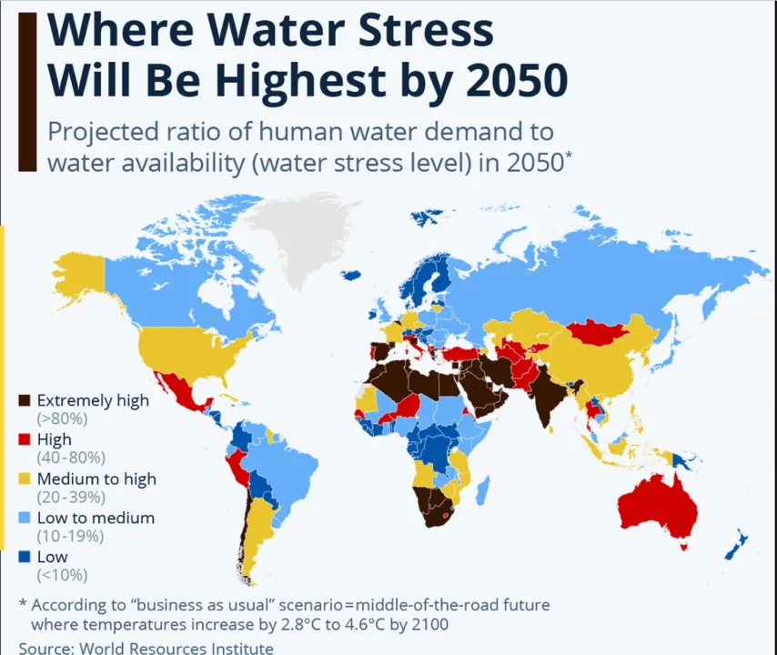 AKTOB'un su tasarrufuna yönelik hazırladığı proje kapsamında çarpıcı bilgilere de yer veriliyor. Buna göre Dünya Kaynakları Enstitüsü'nün (WRI) 2050 yılına kadar su stresinin en yüksek olacağı bölgeleri gösteren 'Su Stresi Haritası'na göre Türkiye, 'kırmızı' yani 'yüksek stres' altındaki bölgede yer alıyor. Türkiye'nin güneyi ve batısı ise 'son derece yüksek stres' bölgeler olarak gösteriliyor. Haritada bölgeler, son derece yüksek (yüzde 80 ve üzeri), yüksek (yüzde 40-80), orta- yüksek (yüzde 20- 39), orta- düşük (yüzde 10- 19), düşük (yüzde 10 ve altı) olarak ifade ediliyor. Ayrıca senaryoya göre sıcaklıkların 2100'de 2,8 ile 4,6 derece arasında artacağı da öngörülüyor.