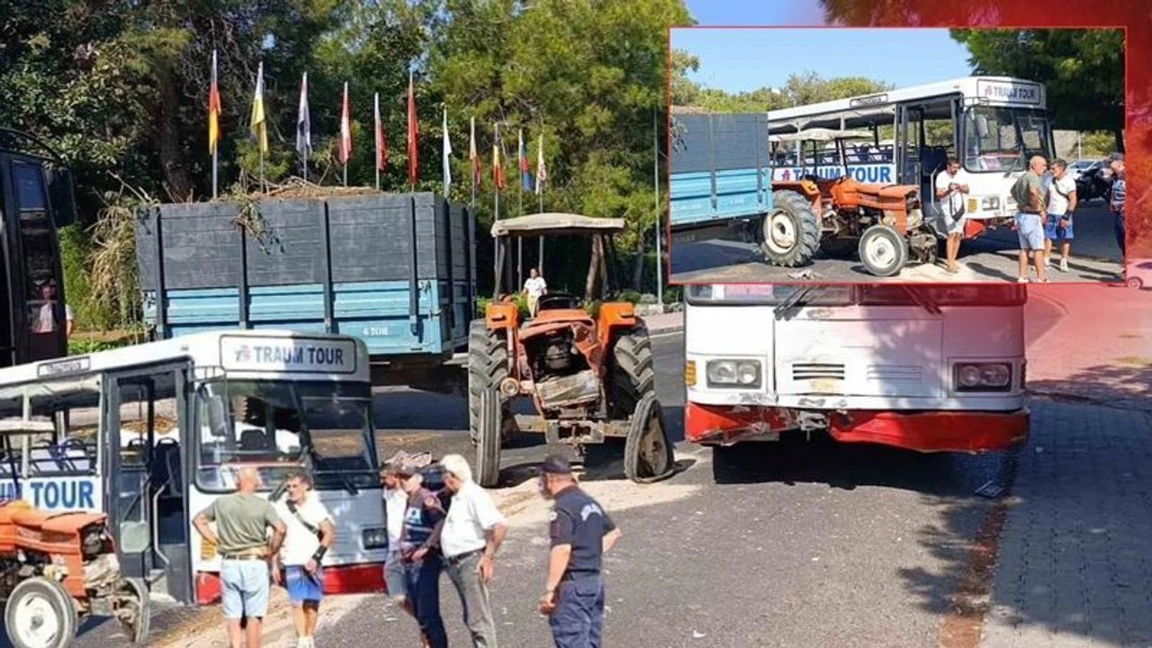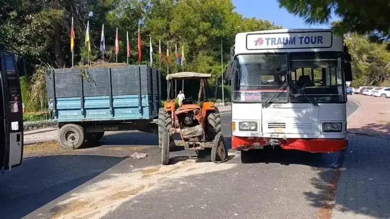 Kaza, dün Sorgun Mahallesi Titreyengöl mevkiinde meydana geldi. Edinilen bilgiye göre, Engin Ç.’nin kullandığı 07 AKB 229 plakalı otellerden safari için yolcu toplayan otobüs, otelin bahçe temizliğinden çıkan ağaç dalları ile otların bulunduğu Murat V.’nin kullandığı 06 VV 560 plakalı traktörle çarpıştı. Kazayı gören otel çalışanlarının 112 Acil Çağrı Merkezi’ne bildirmesi üzerine olay yerine jandarma ve sağlık ekipleri sevk edildi.