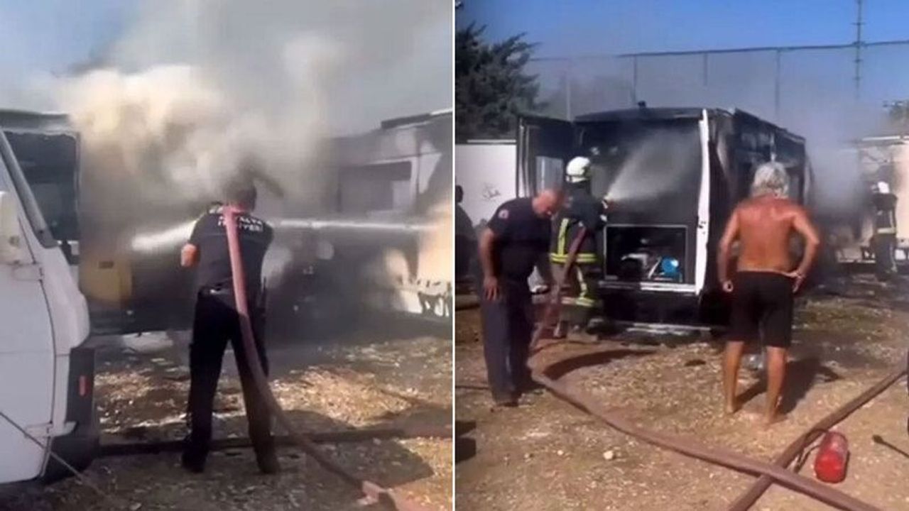 Yangında 2 karavan tamamen yanarak kullanılamaz hale geldi. Yangının çıkış nedeni araştırılıyor.