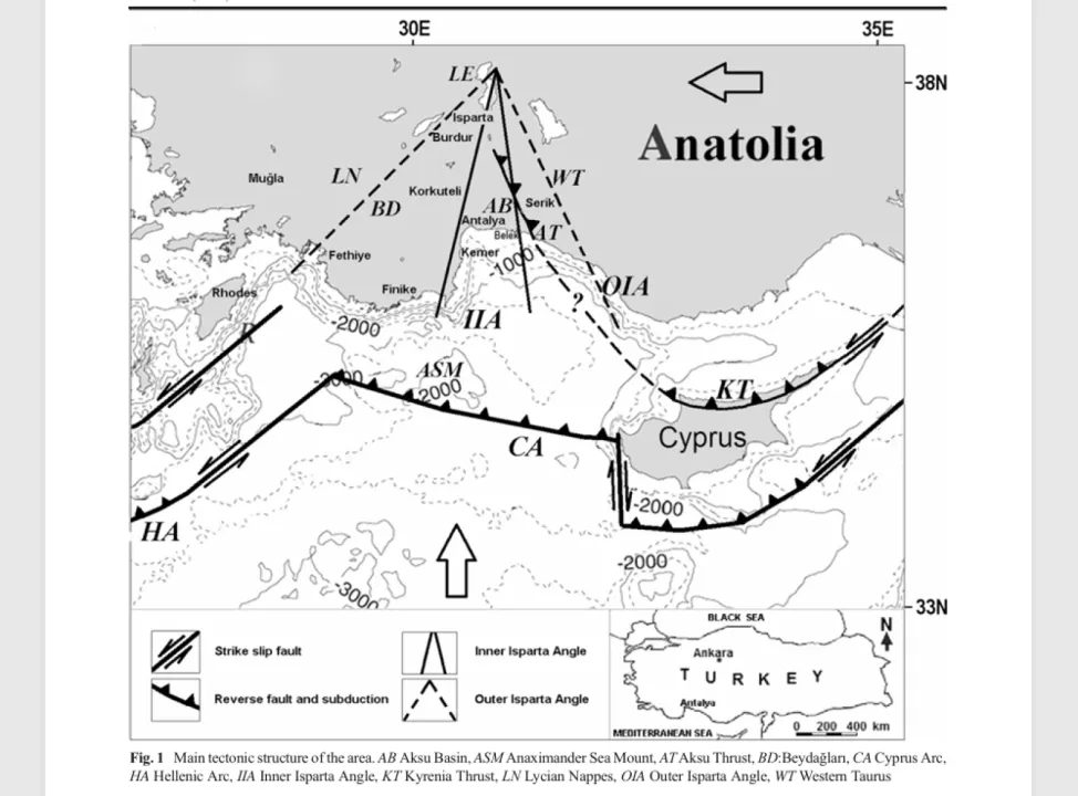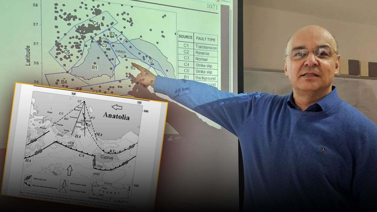 Antalya civarında asıl büyük deprem üretebilecek fayımız dalma batma zonu fayıdır. Bu Kıbrıs'ın Baf açıklarında başlar. Baf'ta da çok büyük depremler üretir. Sonra yine denizaltından, Finike denizaltı dağlarının güneyinden başlar dalmaya. Kuzeye doğru kama şeklinde Antalya'nın altına doğru dalar. Antalya'nın il merkezinin hizasına geldiğinde derinlik 90 kilometreyi bulur. O yüzden bu fay çok büyük deprem üretir. Ama biz hissetmiyoruz. Çünkü Antalya'nın hizasına geldiğinde, iz düşümüne geldiği zaman 90 kilometre aşağıda oluyor. Açıklarda olduğu zaman da yine 90 kilometre uzağımızda oluyor. Büyük deprem ama biz az hissediyoruz."