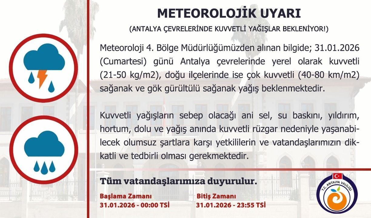 Meteoroloji 4. Bölge Müdürlüğü tarafından yapılan açıklamada, 31 Ocak Cumartesi günü Antalya çevrelerinde yerel olarak kuvvetli sağanak yağışların etkili olacağı bildirildi. Açıklamada, kent genelinde 21–50 kilogram metrekare aralığında yağış öngörülürken, doğu ilçelerinde ise yağış miktarının 40–80 kilogram metrekareye kadar çıkmasının beklendiği kaydedildi. Yağışların zaman zaman gök gürültülü sağanak şeklinde görülebileceği belirtildi.