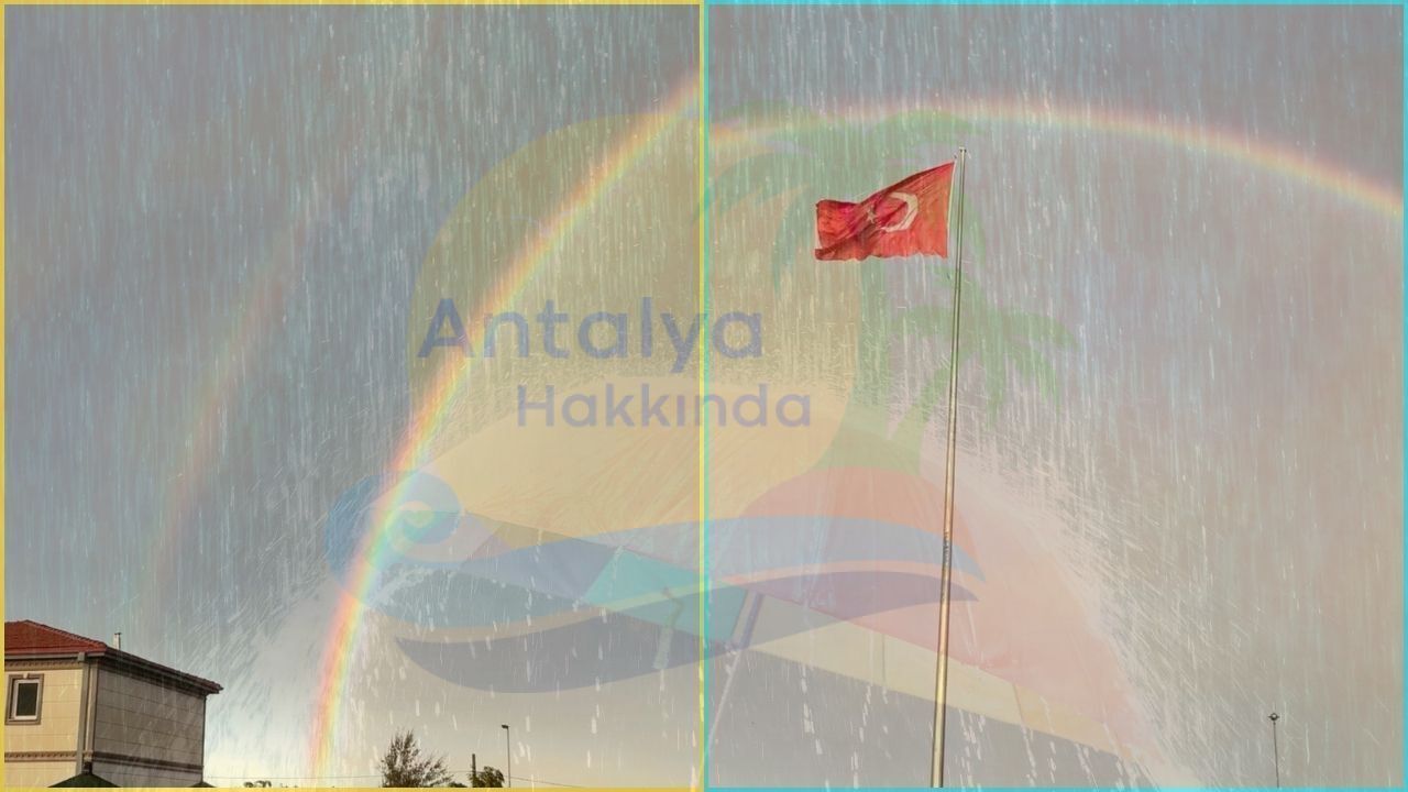 Şiddetli yağışın ardından gökyüzündeki karanlık ve kasvetli hava yerini gökkuşağına bıraktı. Bir vatandaşın cep telefonuna yansıyan görüntülerde canlı ve net şekilde Türk Bayrağı'nın ardında görüntülenen gökkuşağı vatandaşların dikkatinden kaçmadı.