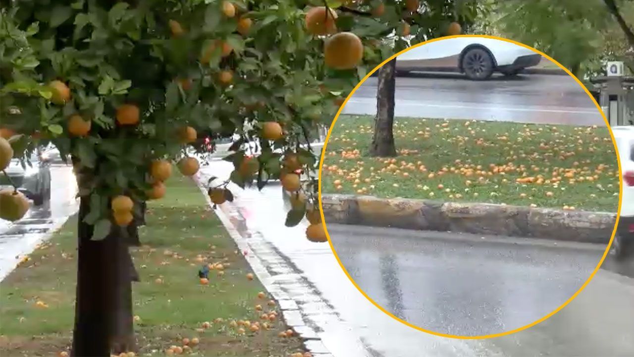 Meteoroloji 4'üncü Bölge Müdürlüğü'nün uyarı yaptığı Antalya'da sağanak ve yer yer gök gürültülü sağanak yağış öğle saatlerinde etkisini gösterdi. Kuvvetli yağış ve rüzgar, kentin simgesi olan turunç ağaçlarının meyvelerinin dökülmesine neden oldu. Turuncu rengi ve görselliğiyle Antalya'da caddeleri süsleyen turunçların refüjlere dökülmüş görüntüsü farklı bir görsellik oluşturdu.