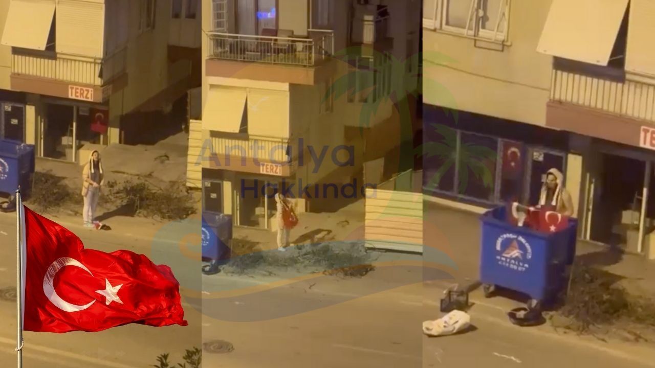 Antalya'nın Muratpaşa ilçesi Zerdalilik Mahallesi Cebesoy Cadesinde esnafların dükkanlarına astıkları Türk bayraklarını toplayan bir kişi aldığı bayraklarla alay eder gibi dans etti. Daha sonra bayrakları bir çöp konteynerine serip bayrakların üzerinde sigara söndürdü.
