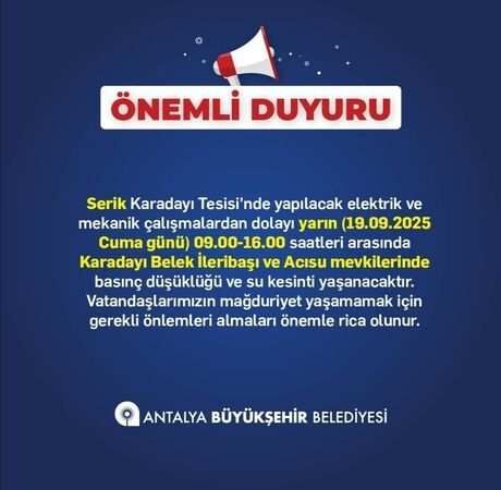 " Serik Karadayı Tesisi'nde yapılacak elektrik ve mekanik çalışmalardan dolayı yarın (19.09.2025 Cuma günü) 09.00-16.00 saatleri arasında Karadayı Belek İleribaşı ve Acısu mevkilerinde basınç düşüklüğü ve su kesinti yaşanacaktır. Vatandaşlarımızın mağduriyet yaşamamak için gerekli önlemleri almaları önemle rica olunur"