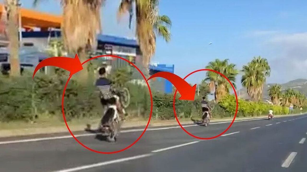 Olay, Antalya'nın Gazipaşa ilçesine bağlı Beyobası Mahallesi D-400 Karayolu Sanayi Kavşağı yakınlarında yaşandı. Kahyalar istikametine seyir halinde olan ve ismi henüz belirlenemeyen bir motosiklet sürücüsü, kask takmadan tek teker üzerinde yolculuk yaptı.