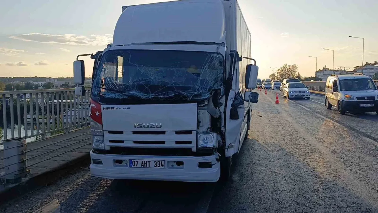 Antalya’nın Manavgat ilçesi Çevreyolu Köprüsü üzerinde meydana gelen kazada, Antalya istikametinden Alanya yönüne gitmekte olan Şadi M. idaresindeki 07 AHT 334 plakalı kamyon, aynı yönde ilerleyen Osman A’nın kullandığı 34 EZE 891 plakalı, 31 AOH 33 dorse plakalı TIR'a sağ arka kısmından çarptı.