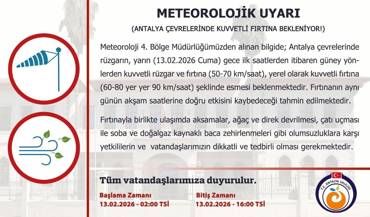 Meteoroloji 4. Bölge Müdürlüğü’nden yapılan açıklamaya göre, 13 Şubat 2026 Cuma günü gece ilk saatlerden itibaren Antalya çevrelerinde güney yönlerden kuvvetli rüzgâr ve fırtına bekleniyor. Rüzgârın 50-70 km/saat hızla eseceği, yer yer 60-80 km/saat ve bazı bölgelerde 90 km/saat hıza ulaşabileceği tahmin ediliyor. Fırtınanın aynı gün akşam saatlerine doğru etkisini kaybetmesi bekleniyor. Uyarının başlangıç saatinin 02.00, bitiş saatinin ise 16.00 olduğu bildirildi.