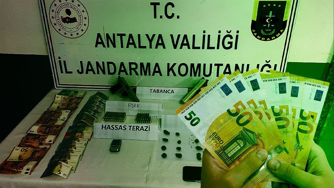 Antalya Manavgat Cumhuriyet Başsavcılığı'nın talimatıyla uyuşturucuyla mücadele kapsamında yürütülen çalışmalar sonucu, Antalya İl Jandarma Komutanlığı ekipleri (R.U.) isimli şüphelinin evinde ve iş yerinde arama yaptı. Yapılan aramalarda, 50 gram skunk, 1 hassas terazi, 2 ruhsatsız 9x19 milimetre tabanca, 82 adet 9x19 milimetre tabanca fişeği, 1 cep telefonu, bin 465 avro, 110 sterlin ve 14 bin 50 lira nakit para ele geçirildi.
