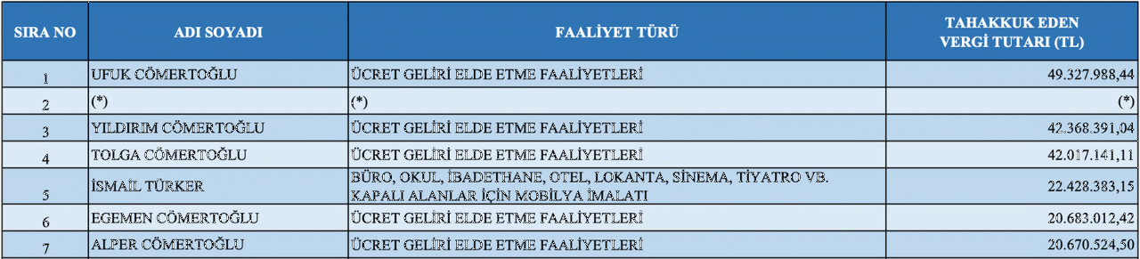 Turizm sektöründe büyük etkisi olan Cömertoğlu Ailesi’nden tam 5 isim, listeye zirveden giriş yaptı.Ödedikleri vergilerle dikkat çeken aile bir rekora da imza atmış oldu. Listede;