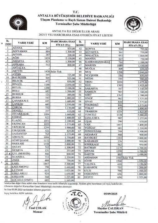 Antalya Büyükşehir Belediyesi tarafından hazırlanan şehirlerarası otobüs harcıraha esas fiyat listesi; Antalya’dan çeşitli illere yapılan yolculuklarda mesafe esaslı ve KDV dâhil ücret bilgilerini içeriyor.