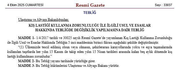 Tebliğ, yayımlandığı gün itibarıyla resmen yürürlüğe girdi. Yetkililer, sürücülerin cezai yaptırımlarla karşılaşmaması için kış lastiği uygulamasına belirtilen tarihlerde mutlaka uymaları gerektiğini hatırlatıyor.