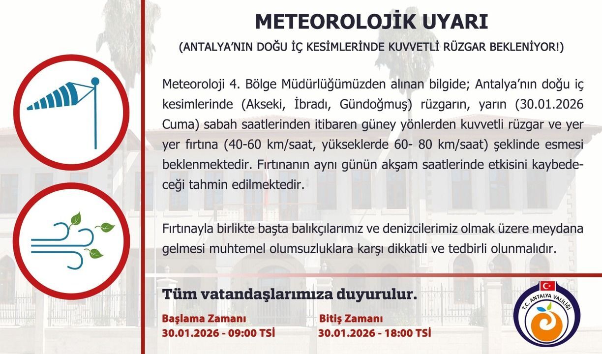 "Yapılan son değerlendirmelere göre; Antalya’nın doğu iç kesimlerinde (Akseki, İbradı, Gündoğmuş) rüzgarın, yarın (30.01.2026 Cuma) sabah saatlerinden itibaren güney yönlerden kuvvetli rüzgar ve yer yer fırtına (40-60 km/saat, yükseklerde 60- 80 km/saat) şeklinde esmesi beklenmektedir. Fırtınanın aynı günün akşam saatlerinde etkisini kaybedeceği tahmin edilmektedir.
