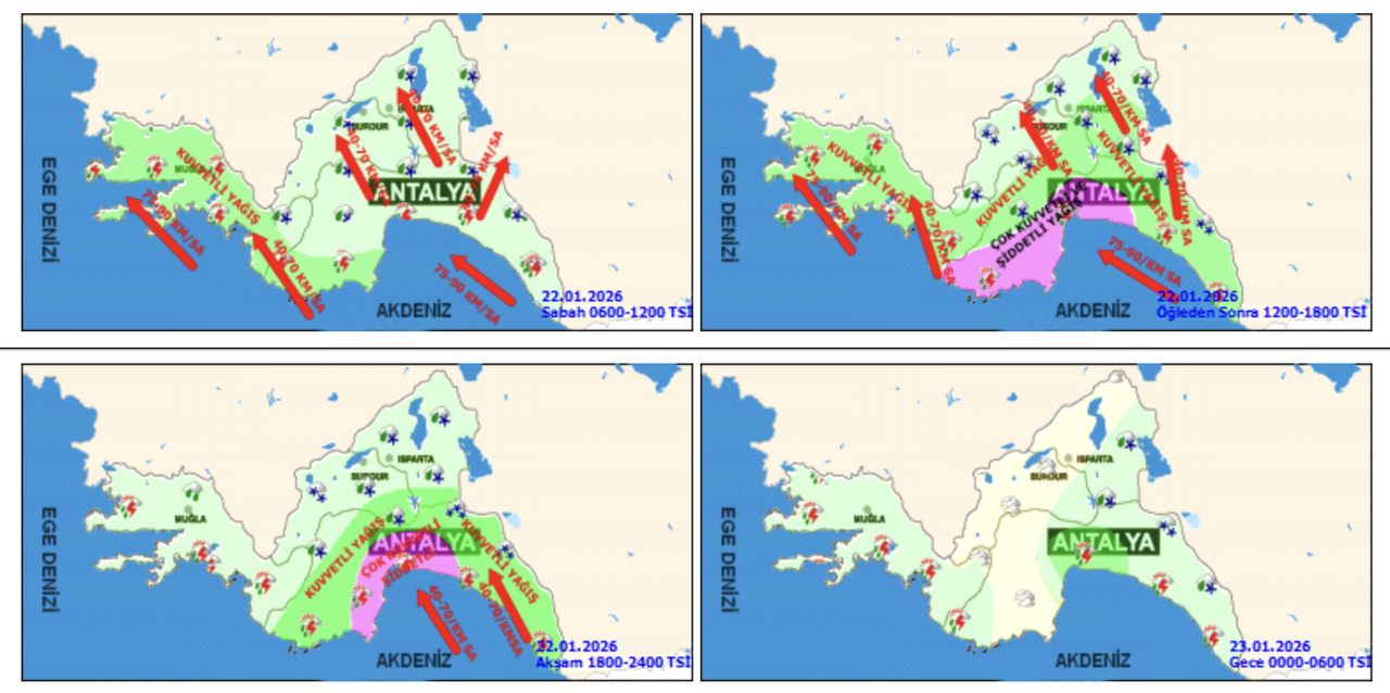 Meteoroloji Genel Müdürlüğü’nden yapılan meteorolojik uyarıya göre; yağışların Antalya ve Muğla çevreleri ile Burdur’un doğu ve Isparta’nın güney kesimlerinde kuvvetli, yer yer çok kuvvetli olması beklenirken, denizlerde rüzgârın güney ve güneydoğu yönlerden kuvvetli fırtına şeklinde eseceği tahmin ediliyor. Ayrıca rüzgârın, güney ve doğu yönlerden Muğla çevreleri ile Antalya’nın doğu iç kesimlerinde fırtına şeklinde etkili olması öngörülüyor.