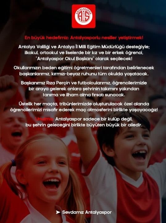 Antalyaspor, Antalya Valiliği ve İl Milli Eğitim Müdürlüğü iş birliğiyle hayata geçirdiği yeni projeyle geleceğin Antalyasporlularını yetiştirmeyi hedefliyor. Proje kapsamında ilkokul, ortaokul ve liselerde bir kız ve bir erkek öğrenci, “Antalyaspor Okul Başkanı” olarak seçilecek. Beden eğitimi öğretmenleri tarafından belirlenecek olan okul başkanları, kırmızı-beyaz kulübün ruhunu okullarında yaşatacak. Antalyaspor Başkanı Rıza Perçin ve futbolcular da öğrencilerle bir araya gelerek, şehir takımıyla bağ kurmalarını sağlayacak.