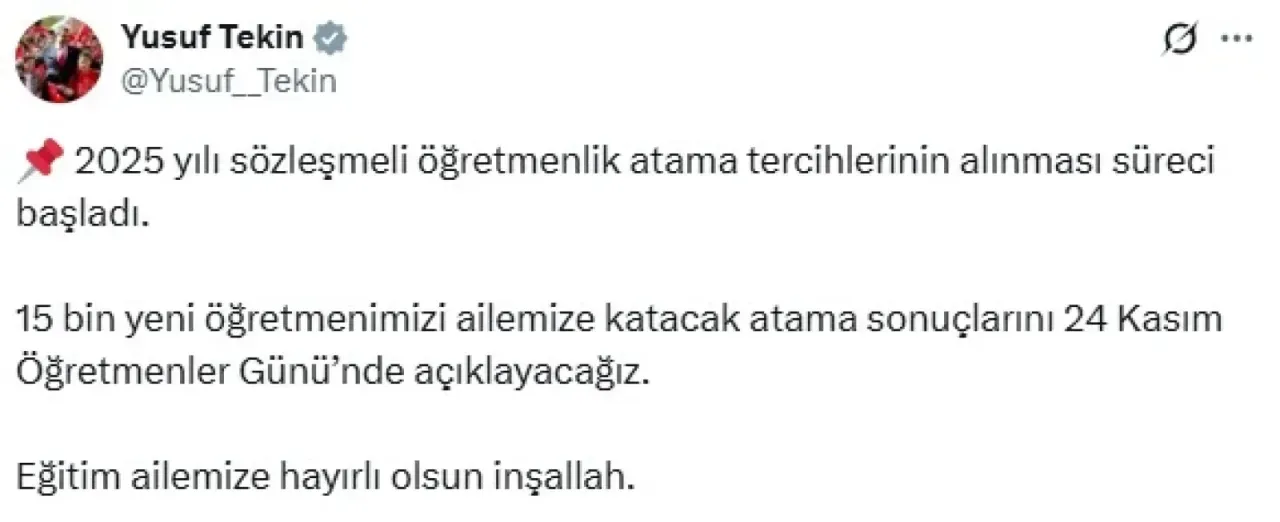 "2025 yılı sözleşmeli öğretmenlik atama tercihlerinin alınması süreci başladı. 15 bin yeni öğretmenimizi ailemize katacak atama sonuçlarını 24 Kasım Öğretmenler Günü’nde açıklayacağız. Eğitim ailemize hayırlı olsun inşallah."