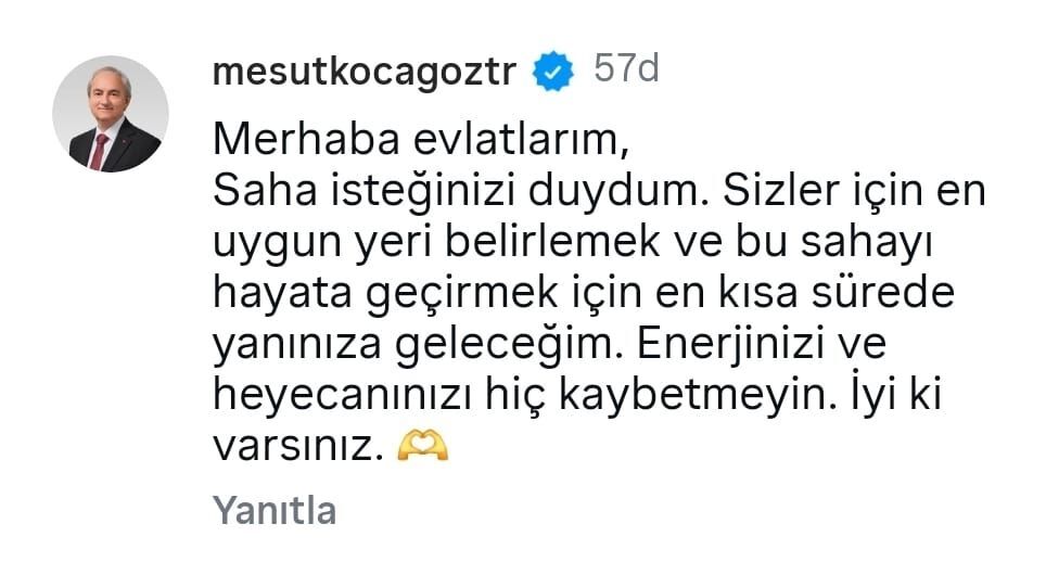 "Merhaba evlatlarım, Saha isteğinizi duydum. Sizler için en uygun yeri belirlemek ve bu sahayı hayata geçirmek için en kısa sürede yanınıza geleceğim. Enerjinizi ve heyecanınızı hiç kaybetmeyin. İyi varsınız."