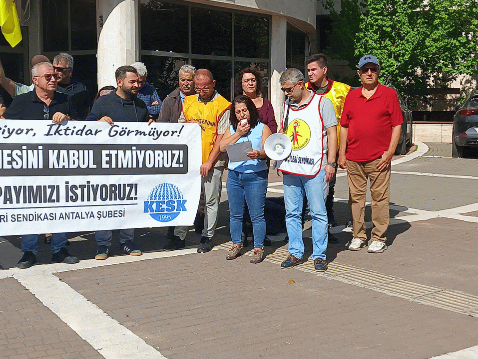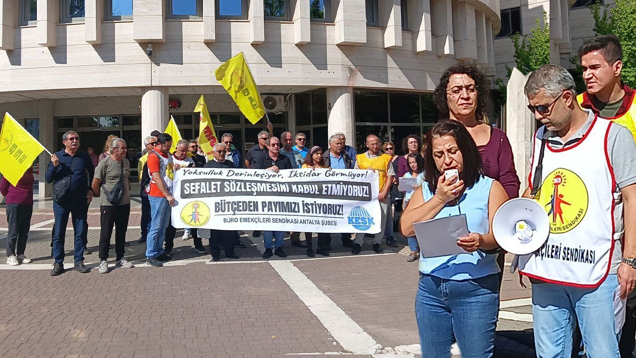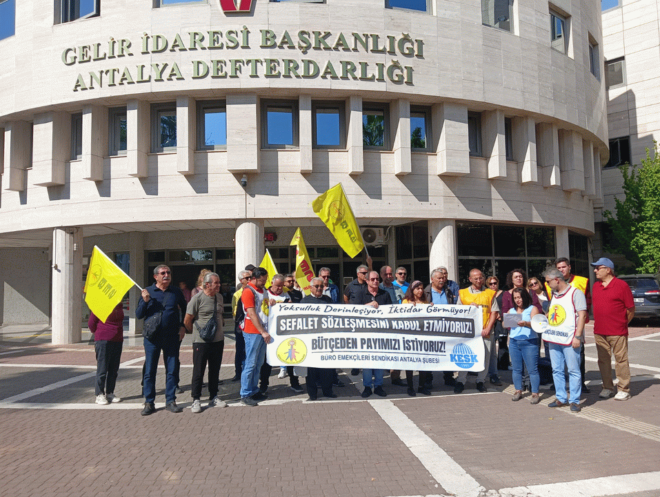 Antalya Defterdarlığı önünde bir araya gelen Büro Emekçileri Sendikası (BES) Antalya Şube Başkanı Devrim Mol yaptığı konuşmada, TBMM’ye sunulan 2026 yılı bütçesiyle birlikte, emekçilere ve toplumun yoksul kesimlerine herhangi bir iyileştirme öngörülmediğini belirtti.