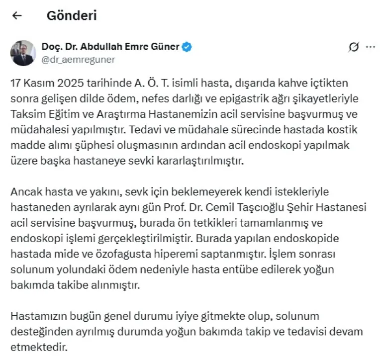 "17 Kasım 2025 tarihinde A. Ö. T. isimli hasta, dışarıda kahve içtikten sonra gelişen dilde ödem, nefes darlığı ve epigastrik ağrı şikayetleriyle Taksim Eğitim ve Araştırma Hastanemizin acil servisine başvurmuş ve müdahalesi yapılmıştır. Tedavi ve müdahale sürecinde hastada kostik madde alımı şüphesi oluşmasının ardından acil endoskopi yapılmak üzere başka hastaneye sevki kararlaştırılmıştır. Ancak hasta ve yakını, sevk için beklemeyerek kendi istekleriyle hastaneden ayrılarak aynı gün Prof. Dr. Cemil Taşcıoğlu Şehir Hastanesi acil servisine başvurmuş, burada ön tetkikleri tamamlanmış ve endoskopi işlemi gerçekleştirilmiştir. Burada yapılan endoskopide hastada mide ve özofagusta hiperemi saptanmıştır. İşlem sonrası solunum yolundaki ödem nedeniyle hasta entübe edilerek yoğun bakımda takibe alınmıştır. Hastamızın bugün genel durumu iyiye gitmekte olup, solunum desteğinden ayrılmış durumda yoğun bakımda takip ve tedavisi devam etmektedir"