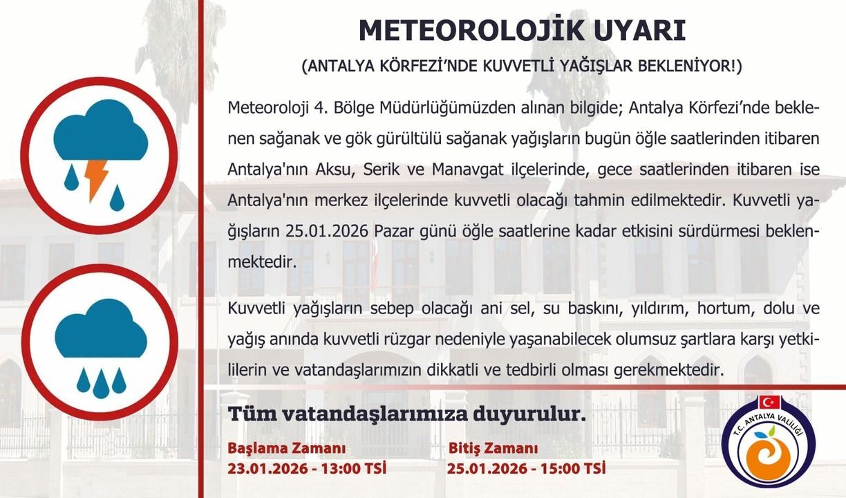 "Meteoroloji 4. Bölge Müdürlüğümüzden alınan bilgiye göre; Antalya Körfezi’nde beklenen sağanak ve gök gürültülü sağanak yağışların bugün öğle saatlerinden itibaren Antalya’nın Aksu, Serik ve Manavgat ilçelerinde, gece saatlerinden itibaren ise Antalya’nın merkez ilçelerinde kuvvetli olacağı tahmin edilmektedir. Kuvvetli yağışların 25.01.2026 Pazar günü öğle saatlerine kadar etkisini sürdürmesi beklenmektedir. Kuvvetli yağışların sebep olacağı ani sel, su baskını, yıldırım, hortum, dolu ve yağış anında kuvvetli rüzgar nedeniyle yaşanabilecek olumsuz şartlara karşı yetkililerin ve vatandaşlarımızın dikkatli ve tedbirli olması gerekmektedir. Tüm vatandaşlarımıza duyurulur.